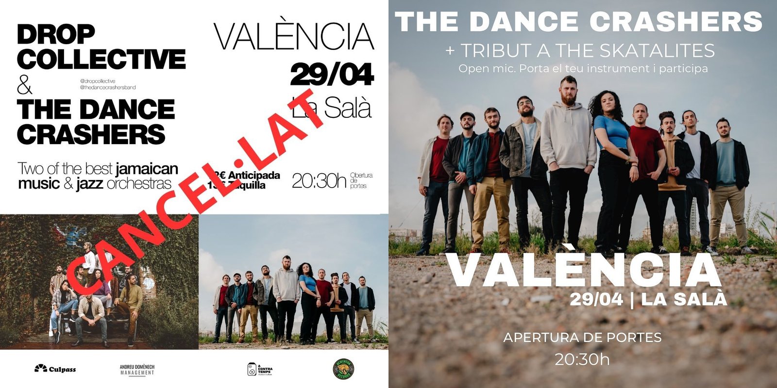 DROP COLLECTIVE: «Por motivos de salud nos vemos obligadas a cancelar nuestra visita a Valencia. Sentimos las molestias que esto le pueda ocasionar a los que ya tenía la entrada. Nos hacía muchísima ilusión venir. Trataremos de encontrar otra fecha para más adelante. Aunque nosotros no estaremos habrá fiesta Jamaicana en @lasalavalencia donde podrá acceder con la entrada que ha adquirido. También puede solicitar un retorno del importe de la entrada contactando a @thedancecrashersband a través del IG. En caso de dificultades también nos puede escribir a dropcollectivebcn@gmail y le ayudaremos a gestionar la devolución.
