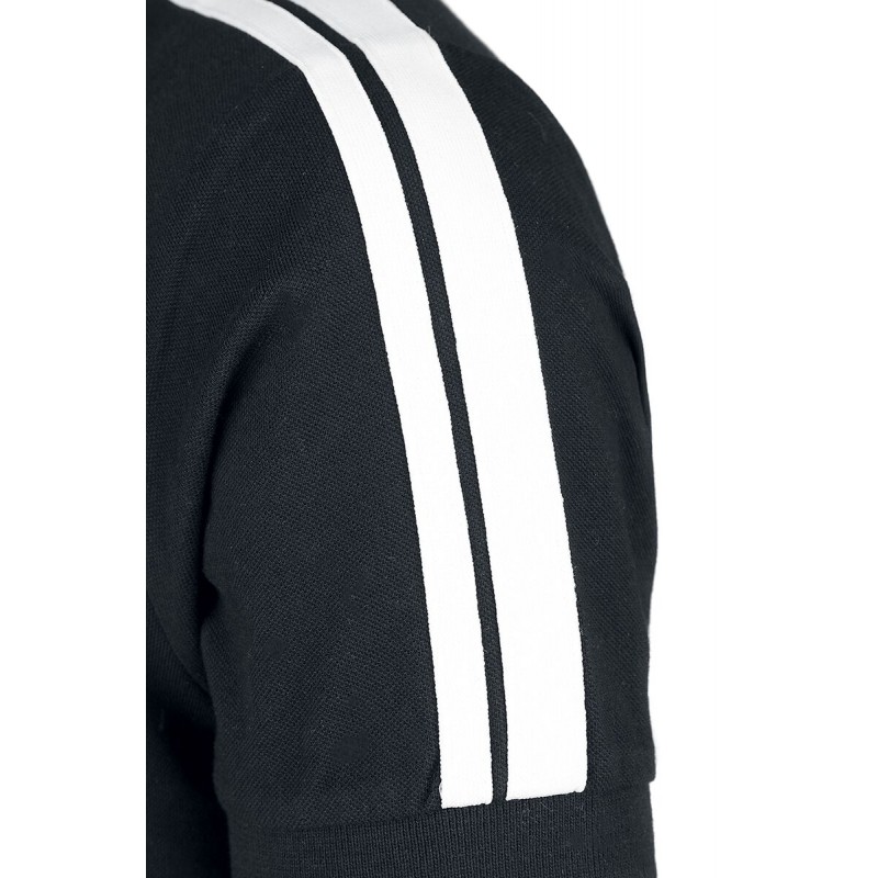 – Model description: Polo shirt with contrasting 3D rubber logo on the left chest. The sewn-on stripes and the buttons correspond to the colour of the logo. The cuffs on the collar and sleeves are made of elastic rib material.