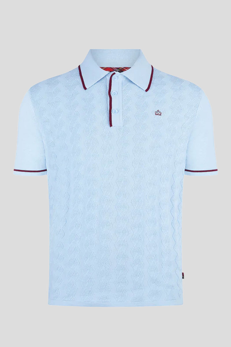 A sharp and stylish cable knit Merc polo with tipped 3-button placket, collars, and arms. Simple and sharp, everyone loves a polo! Available in sky blue and burgundy the Smith is a classic piece of British heritage fashion.