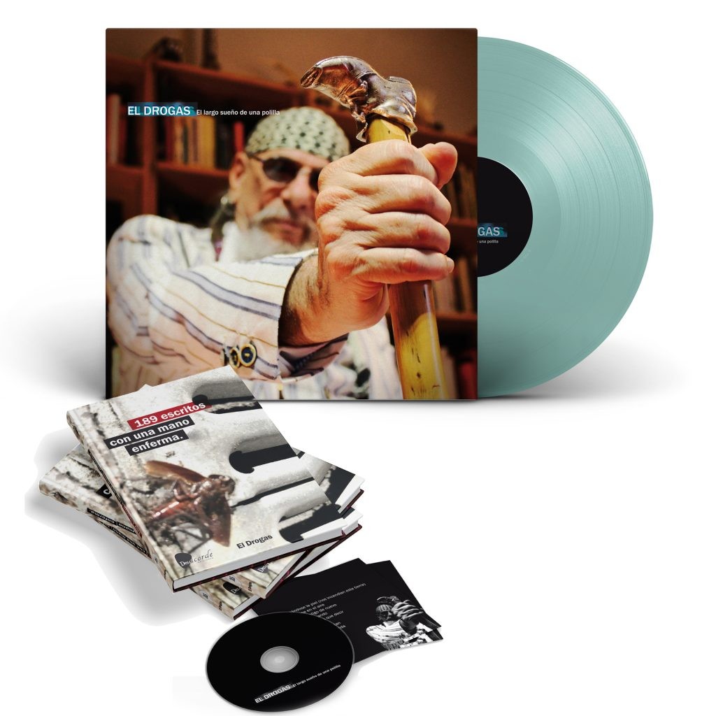 El nuevo proyecto literario y musical de Enrique Villarreal «El Drogas«. Un trabajo conceptual que amplía su universo creativo y con el que se legitima, además de en su faceta musical, como una voz reconocible en la poesía contemporánea. De un lado “189 escritos con una mano enferma”, un cuidado y voluminoso libro-disco que incluye “El largo sueño de una polilla”, un nuevo disco en versión CD. Por el otro, la edición en vinilo de color del mencionado disco, con su material gráfico ampliado y un lujoso acabado para coleccionistas.