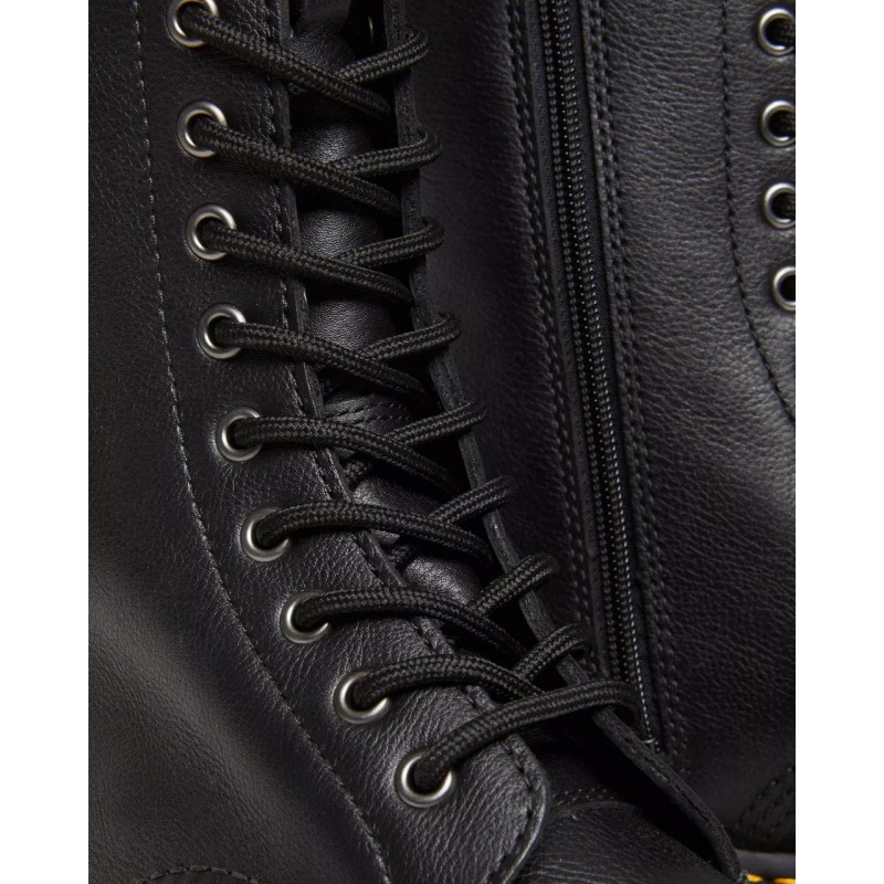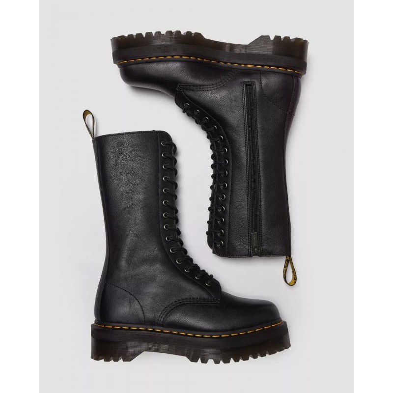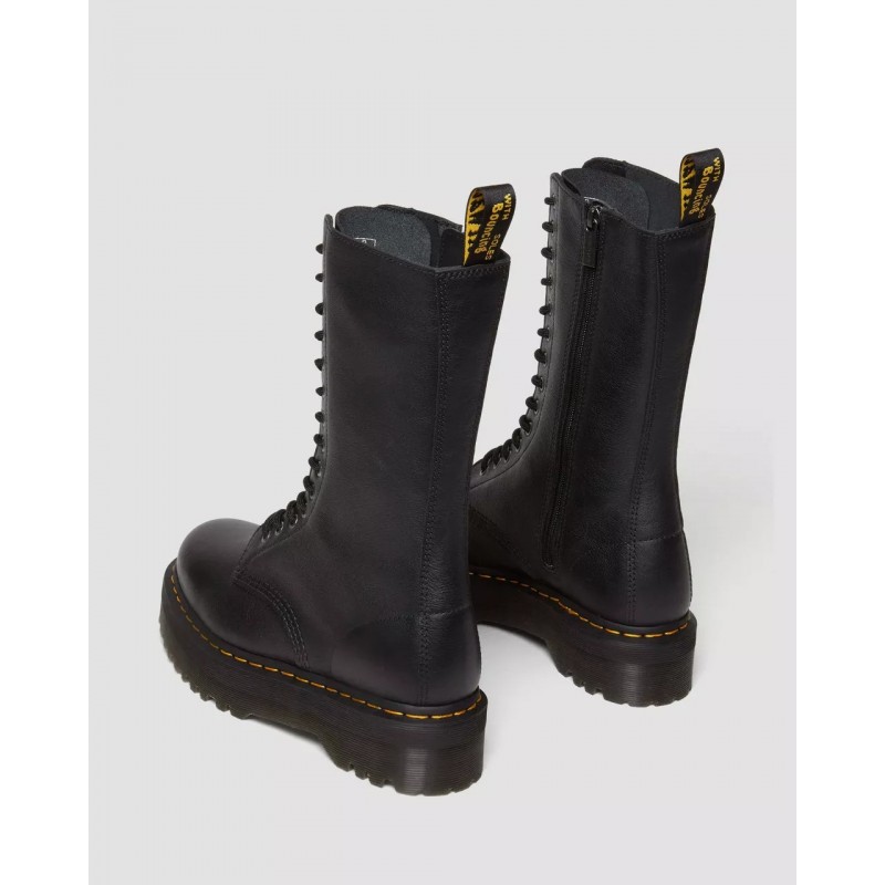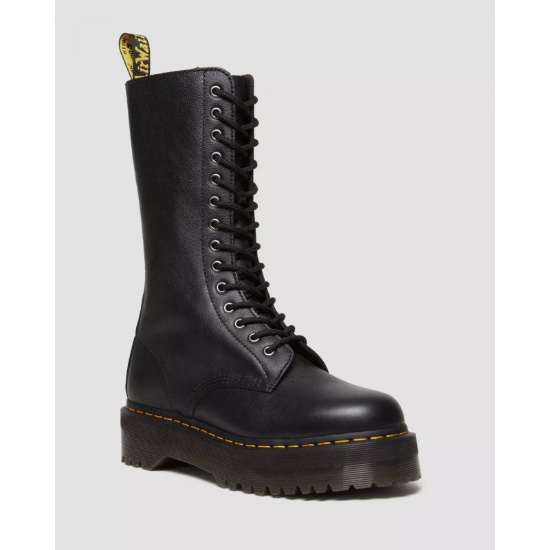Botas altas con mucho carácter. Las 1B99 Quad redefinen la clásica silueta de 14 ojales con la piel blanda Pisa y con la imponente suela Quad. Cuentan con una cremallera interior, ojales plateados y costuras negras. Y el inconfundible ADN DM de pies a cabeza: el tirador de talón, la suela acanalada y el clásico pespunte amarillo.