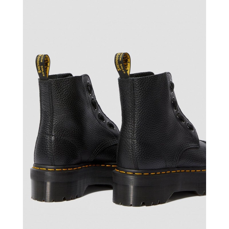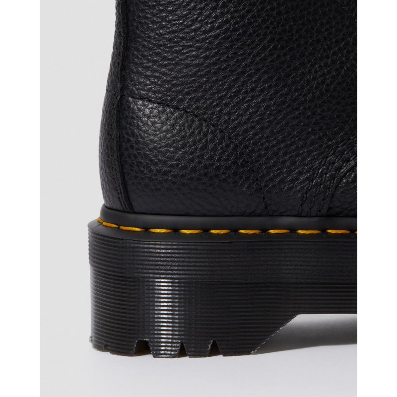 Confeccionadas con la emblemática suela con cámara de aire Airwair™ de Dr. Martens Hechas para durar con el resistente cerco Goodyear Todos los elementos característicos del ADN de Dr. Martens: el pespunte, la suela con surcos laterales y el tirador con el logo Fabricadas en cuero Polished Smooth, el cuero original de Dr. Martens con un acabado pulido que aporta un mayor brillo Tacón con altura de 5 cm y plataforma de 3,8.