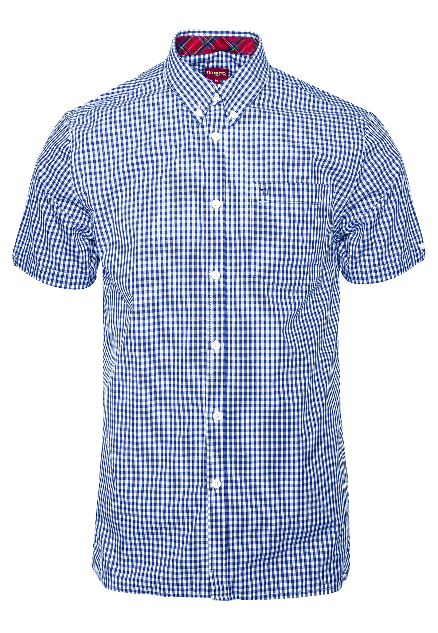 Camisa de manga corta de cuadros con cuello abotonado, bordado Merc en el pecho, pliegues en la parte trasera y pinzas dobles.