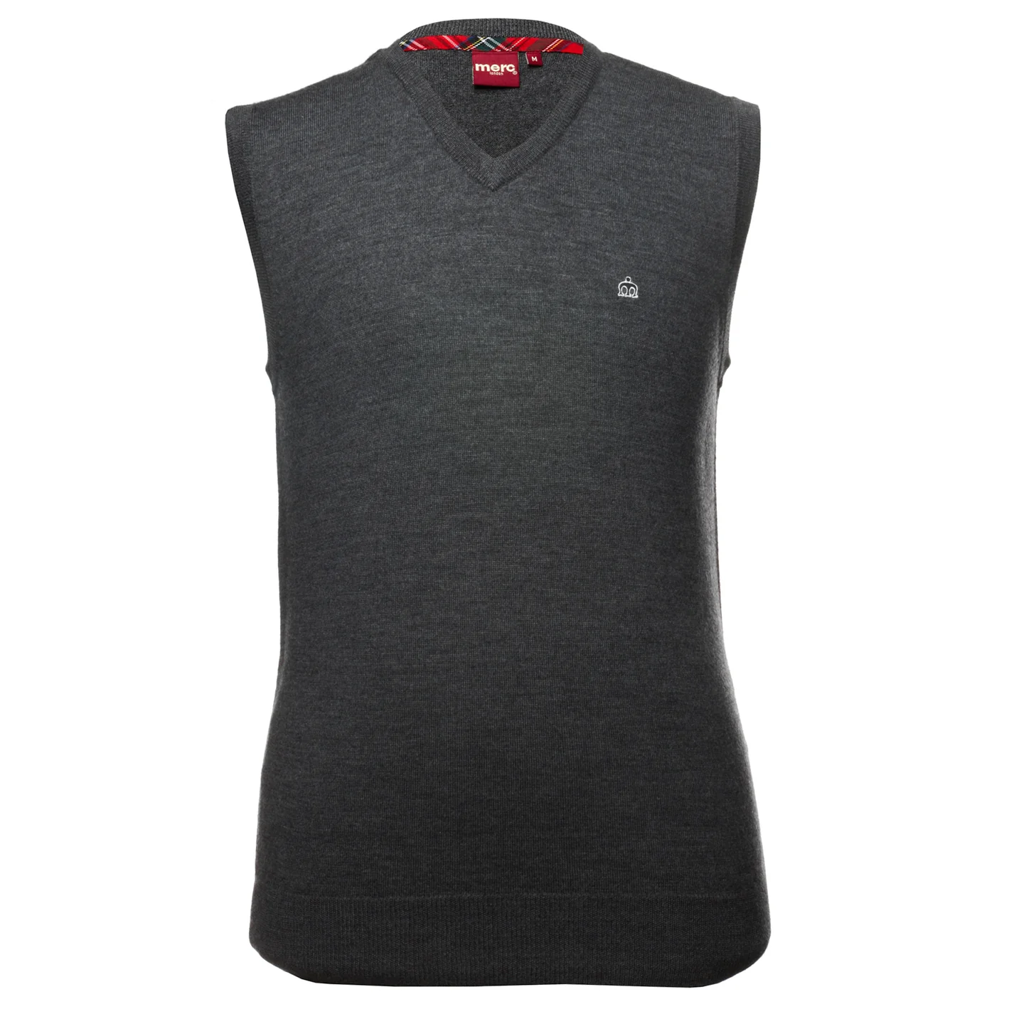 Chaleco de lana sin mangas y cuello en V para hombre, con detalles de ribete suave alrededor del cuello, las sisas y el dobladillo, y acabado con la corona Merc bordada en el pecho. Jenz es una prenda básica de la gama de prendas de punto para hombre de Merc y es un complemento ideal para cualquier camisa de manga larga.