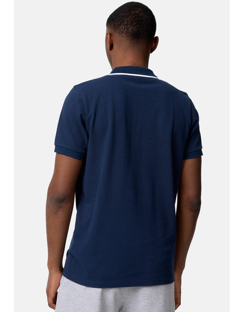 Polo con pequeño logotipo bordado en el pecho. El cuello presenta una franja en contraste que combina con el color del bordado. La tapeta se puede abrir y cerrar con tres botones.